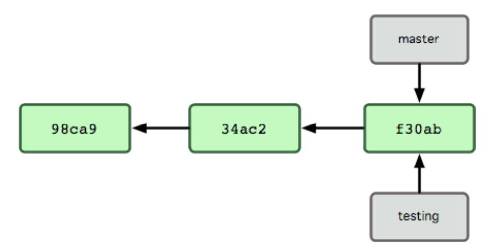 如果你在master再作修改,再提交,其实很明显,提交内容是不包括你testing分支的新增内容的,因为它目前指向的是前一个提交对象: