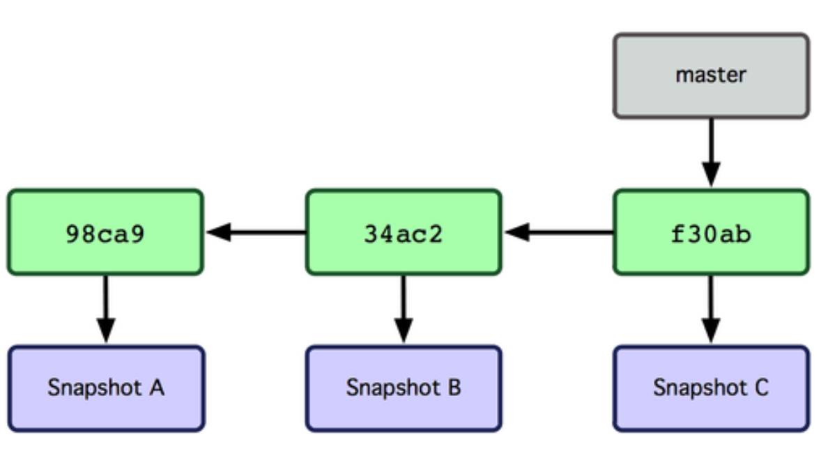 分支指向最新一个提交对象,git默认第一个分支为master,那么如下图: