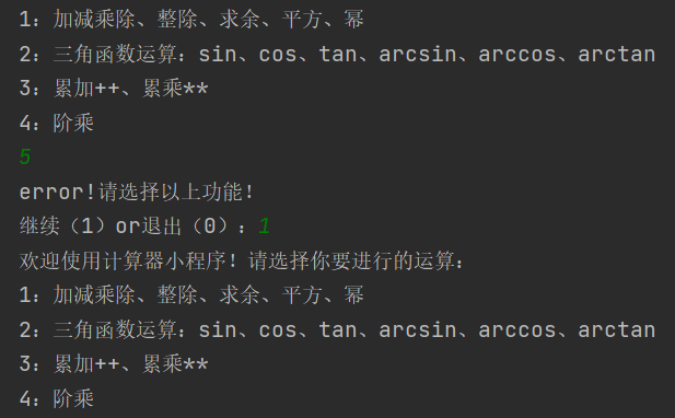当输入序号不在1~4范围内时,提示“error!请选择以上功能”并重新进行选择: