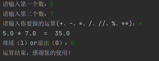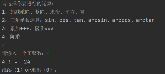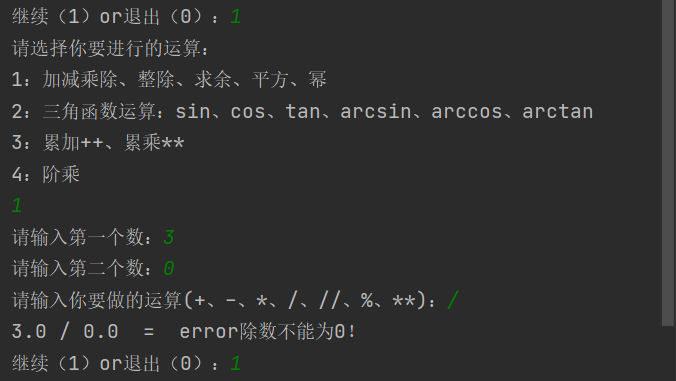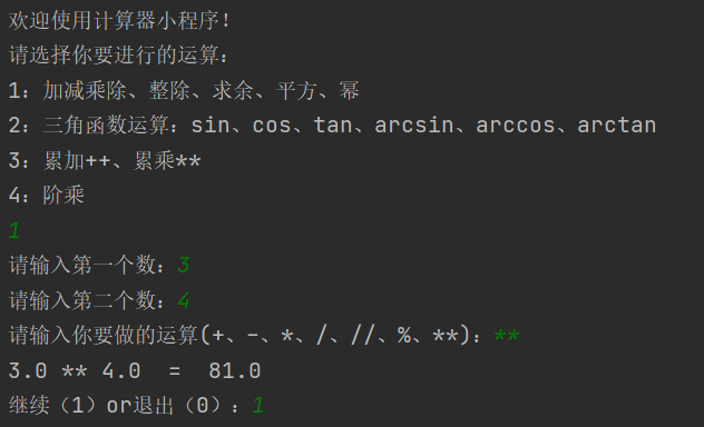 每次计算完毕后询问是否进行下一次运算,“1”继续,“0”退出: