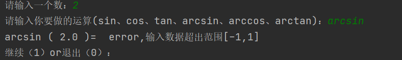 当选择arcsin、arccos且输入数据超出[-1,1]范围时,提示“error,输入数据超出范围[-1,1]”