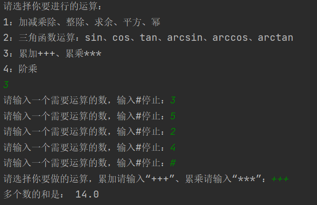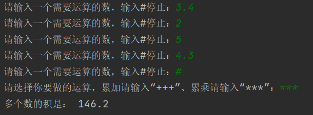 根据提示依次输入所要运算的数据,“#”停止,再选择所要进行的运算,得到结果