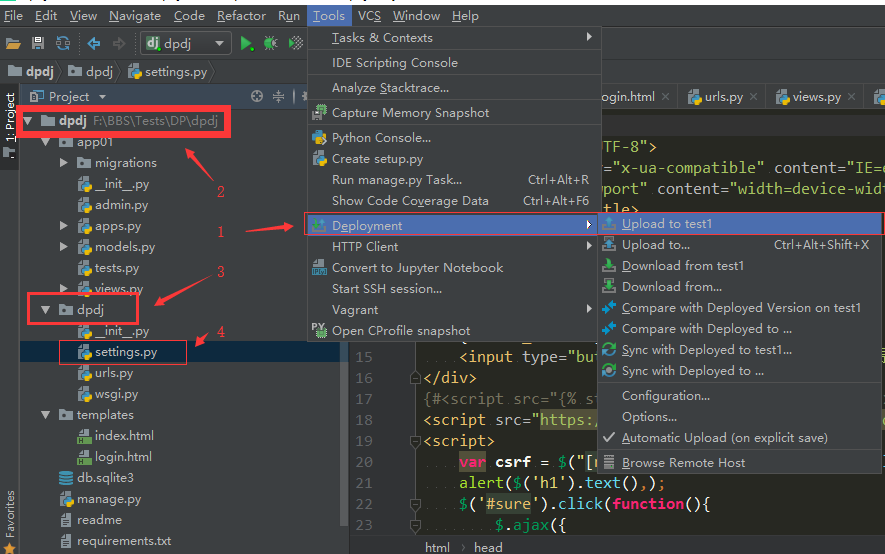 PyCharm --> Tools --> Deployment --> Upload to test1(取决于你的项目名)