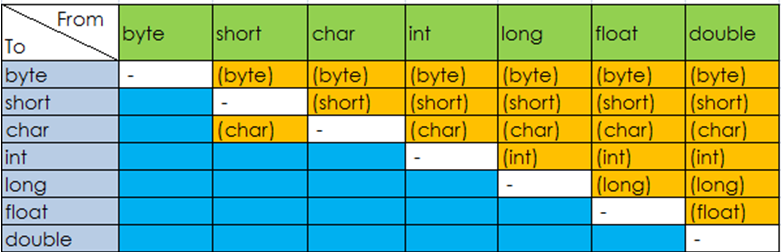 自动转换时发生扩宽(widening conversion)。因为较大的类型(如int)要保存较小的类型(如byte),内存总是足够的,不需要强制转换。如果将字面值保存到byte、short、char、long的时候,也会自动进行类型转换。注意区别,此时从int(没有带L的整型字面值为int)到byte/short/char也是自动完成的,虽然它们都比int小。在自动类型转化中,除了以下几种情况可能会导致精度损失以外,其他的转换都不能出现精度损失。