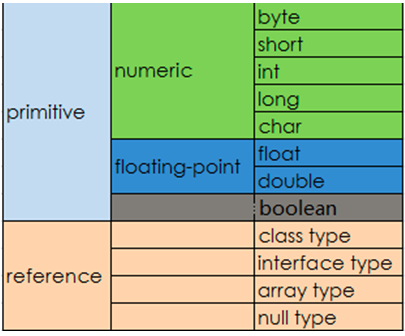 在Java源代码中,每个变量都必须声明一种类型(type)。Java数据类型(type)可以分为两大类:基本类型(primitive types)和引用类型(reference types)。primitive types 包括boolean类型以及数值类型(numeric types)。numeric types又分为整型(integer types)和浮点型(floating-point type)。整型有5种:byte short int long char(char本质上是一种特殊的int)。浮点类型有float和double。关系整理一下如下图: