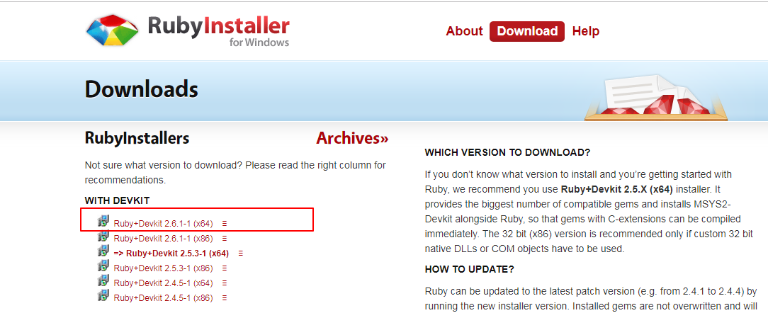 因为Jekyll是基于Ruby开发的,因此,我们需要在服务器上安装下Ruby,下载地址:https://rubyinstaller.org/downloads/。
