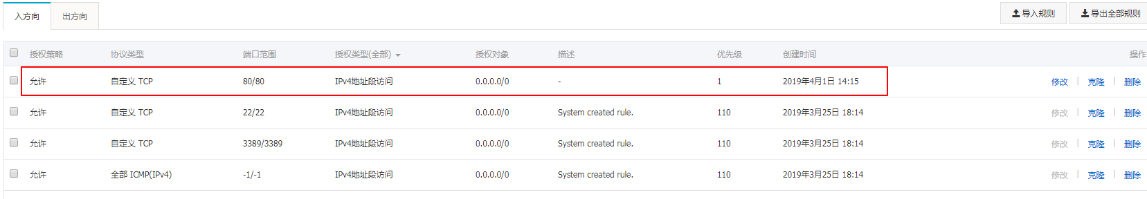 在阿里云控制台找到自己购买的ECS实例,配置安全组规则,因为我们使用的是默认的端口号80,因此添加的安全组规则如下: