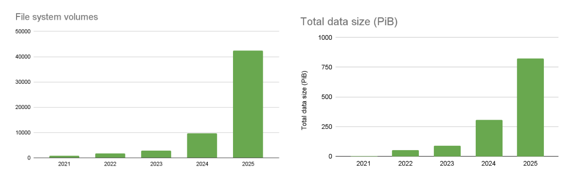 v1.3 新增 issue 数量 366 个,合并的 PR 数量为 696 个,贡献者人数 60人。根据用户匿名上报的数据,目前文件系统总数已突破 40,000 个,数据总量超 800PiB,从 2023年开始加速增长显著。