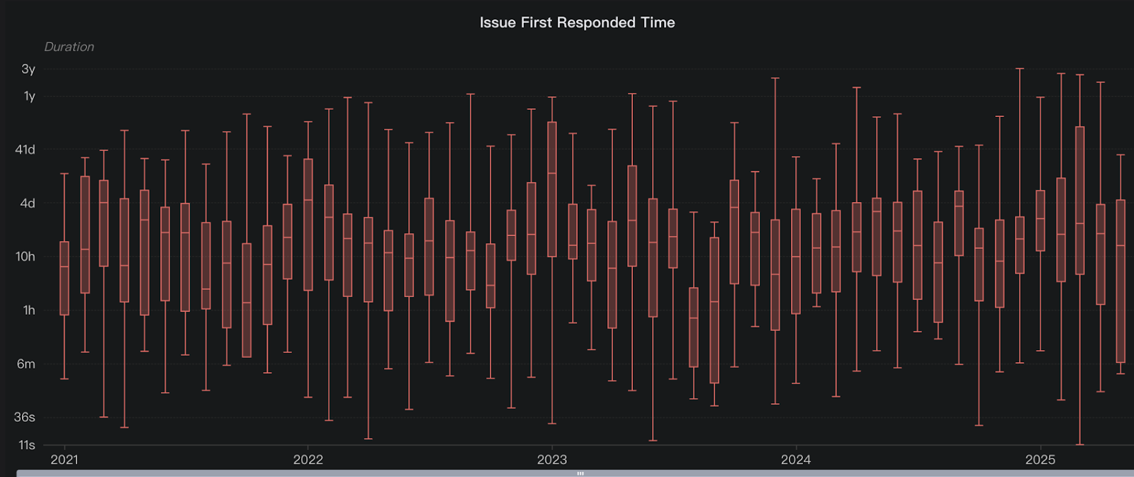 下图是我们对 GitHub 上提出的 issue 的回应情况。整体来看,响应时间(中位数)从 2021 年开源至今,都保持稳定,团队始终积极响应社区版的反馈。(数据来源:OSSInsight)
