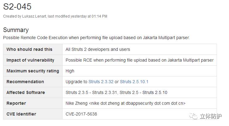 近期struts2 框架再现高危远程命令执行漏洞,漏洞编号S2-045,CVE编号CVE-2017-5638。利用此漏洞可对使用了struts2框架的网站进行远程命令执行,对服务器造成威胁。请相关单位进行及时自检,漏洞详情及修补方案请及时关注官方公告。官方公告链接:https://cwiki.apache.org/confluence/display/WW/S2-045?from=groupmessage&isappinstalled=0