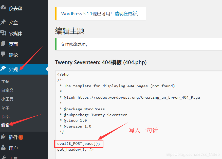 百度了一下WordPress的相关信息,看到,原来外观和插件的php文件可直接编辑(鸡肋),于是乎插入一句话并保存,我用的是这个404模板,路径为.........../wordpress/wp-content/themes/twentyseventeen/404.php,前面根据自己网址自行补充。