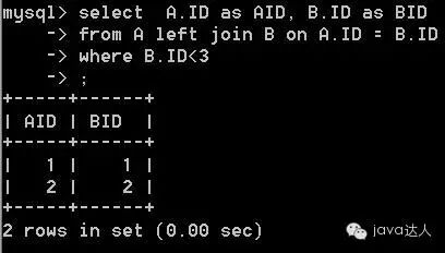 select A.ID as AID, B.ID as BID from A left join B on A.ID = B.ID where B.ID<3
