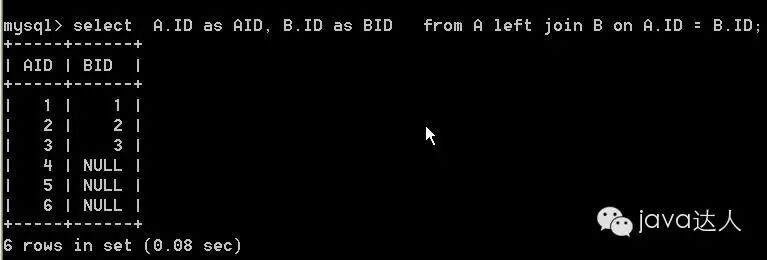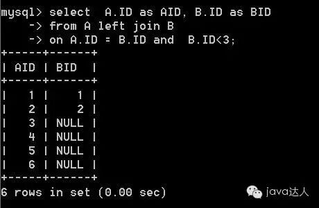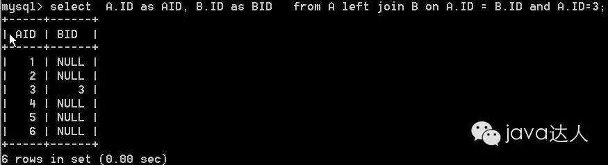 但是我们也发现 AID 与 中AID 1 于2对应的值为NULL,关联表只取了满足A表筛刷选条件的值。