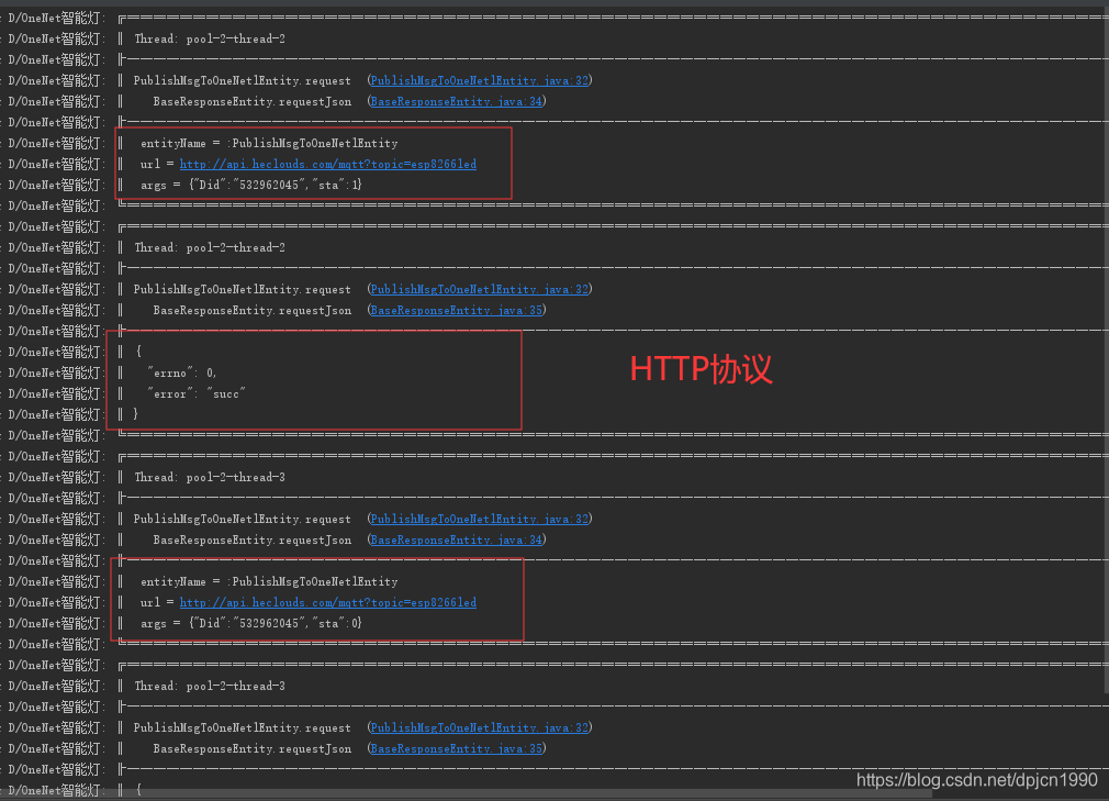 - 整体的测试结果跟 博文 玩转OneNET物联网平台之MQTT服务④ —— 远程控制LED(数量无限制)+ Android App控制 一直,这里就不重复了。博主贴上App发送Http请求的日志内容: