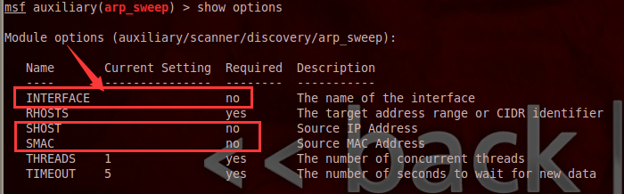 我们可以看到这几项是没有的,当然RHOSTS是我们的目标IP,后面是肯定要设置的,但其余的这几个Required项显示no的地方也是要设置的,INTERFACE就是网卡(ifconfig看下自己的网卡),SHOST和SMAC就是自己IP和Mac地址,这些都用ifconfig找到,然后用set来设置就行了。