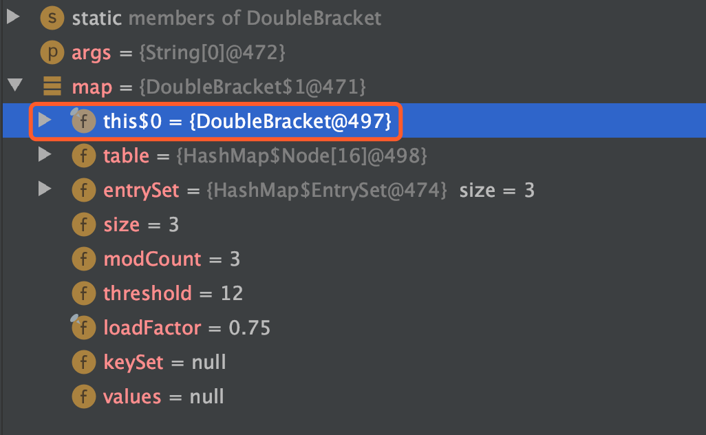 当我们开启调试模式时,可以看出 map 中持有了外部对象 DoubleBracket,如下图所示:
