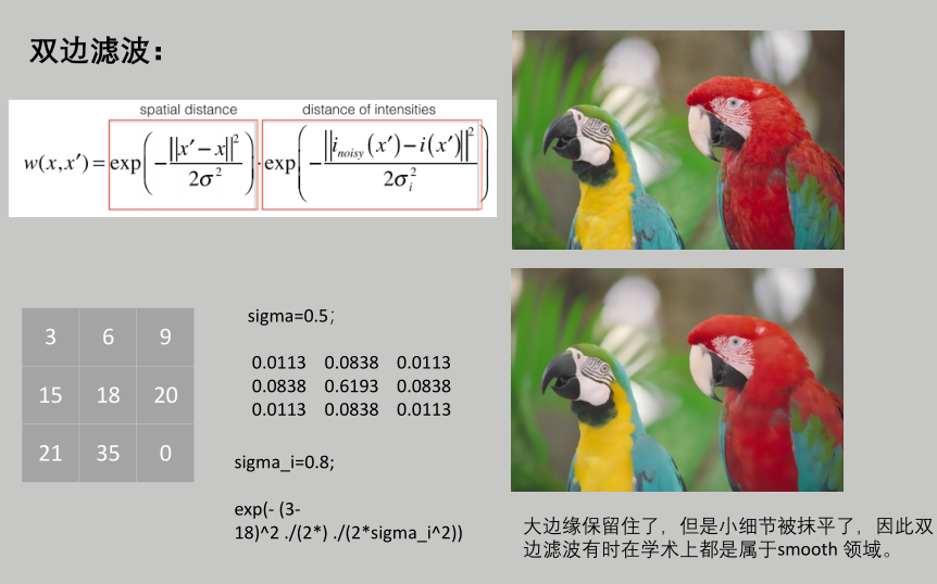2、双边滤波(不仅和距离有关,还和相邻像素的相似度有关(如果pixel值接近则权重几乎不衰减))