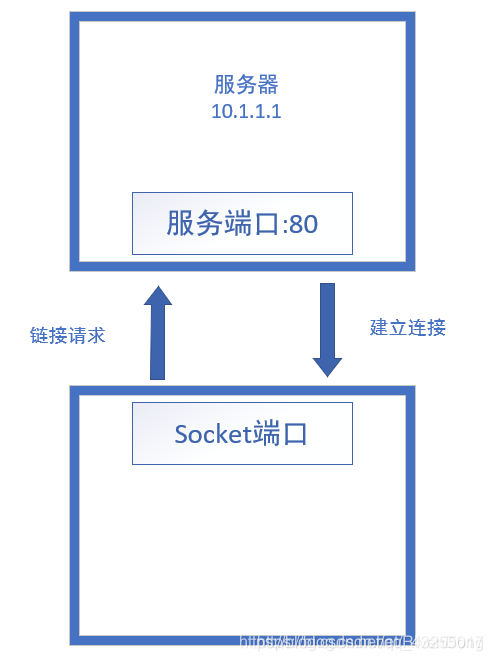 - 客户端必须知道服务器的IP地址或主机名、服务开放端口,客户端向服务器的服务Socket(10.1.1.1:80)发起请求。
