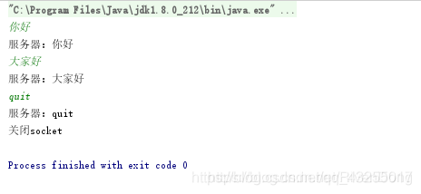 System.out.println("客户端["+socket.getPort()+"]:"+ msg); //回复客户发送的消息 bufferedWriter.write("服务器:" + msg + "\n"); bufferedWriter.flush(); //保证缓冲区的数据发送出去 //查看客户端是否退出 if(QUIT.equals(msg)){ System.out.println("客户端["+socket.getPort()+"]已退出"); break; } } } }catch (IOException e){ e.printStackTrace(); }finally { if (serverSocket != null){ try { serverSocket.close(); System.out.println("关闭ServerSocket"); } catch (IOException e) { e.printStackTrace(); } } } }}