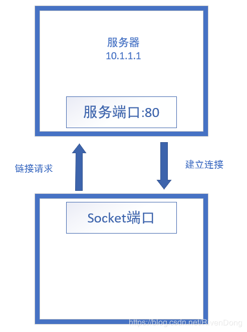 - 客户端必须知道服务器的IP地址或主机名、服务开放端口,客户端向服务器的服务Socket(10.1.1.1:80)发起请求。