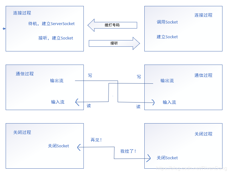 服务端和客户端之间通信的Socket一旦连接,就会通过一对输入输出流进行通信。如同打电话时,一旦被叫放接听,双方通话的业务信道建立,就可以交流了。