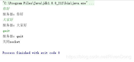 //查看用户是否退出 if(QUIT.equals(input))break; } }catch (IOException e){ e.printStackTrace(); }finally { if(bufferedWriter != null){ try { bufferedWriter.close(); System.out.println("关闭socket"); } catch (IOException e) { e.printStackTrace(); } } } }}