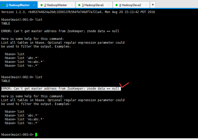 问题描述如下: hbase(main)::> list TABLE ERROR: Can't get master address from ZooKeeper; znode data == n ...