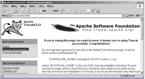 推荐读者使用现在最流行的Web服务器中间件软件Tomcat、Weblogic或Websphere,其中Tomcat是开源免费的,读者可以从http://www.apache.org网站下免费下载得到,本书也将使用Tomcat作为Web服务器端的中间件软件。