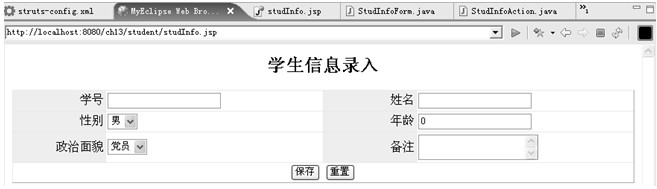 上述代码中使用了Struts HTML标签,表单为<html:form>标签,输入信息的标题使用了<html:form>标签,输入信息内容使用了<html:textarea>标签。