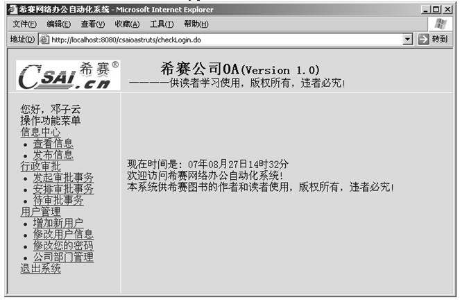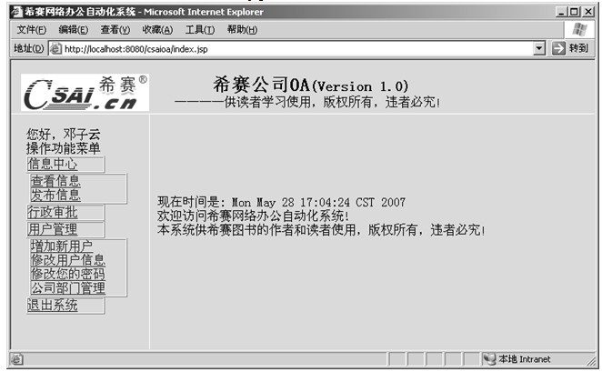 本章基于Struts和JSTL技术对第14章中实现的办公自动化系统作了全面的改进,用Struts框架来架设系统的整体架构,将表示逻辑、业务逻辑、数据验证逻辑清晰的分了开来,在JSP页面中结合了JSTL和Struts HTML标签,使JSP页面中不出现一句Java代码。