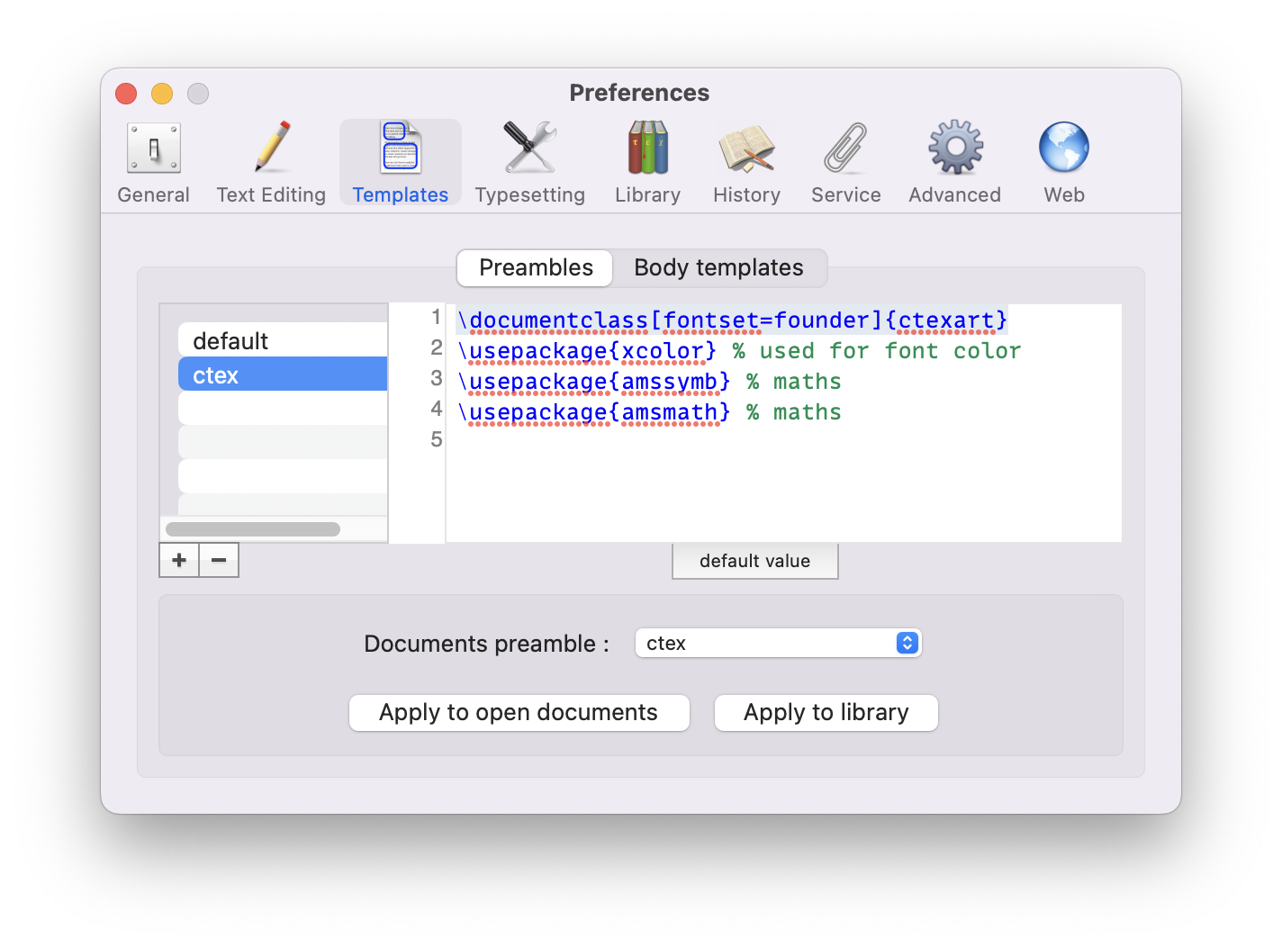 首先在设置中打开 Templates,新增一个 Preamble 模板,名称可以起为