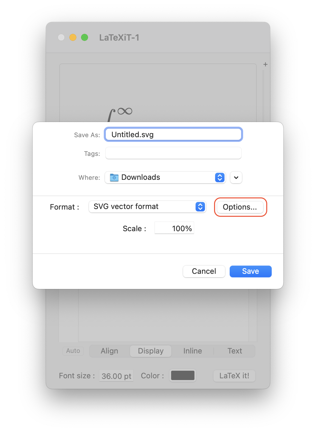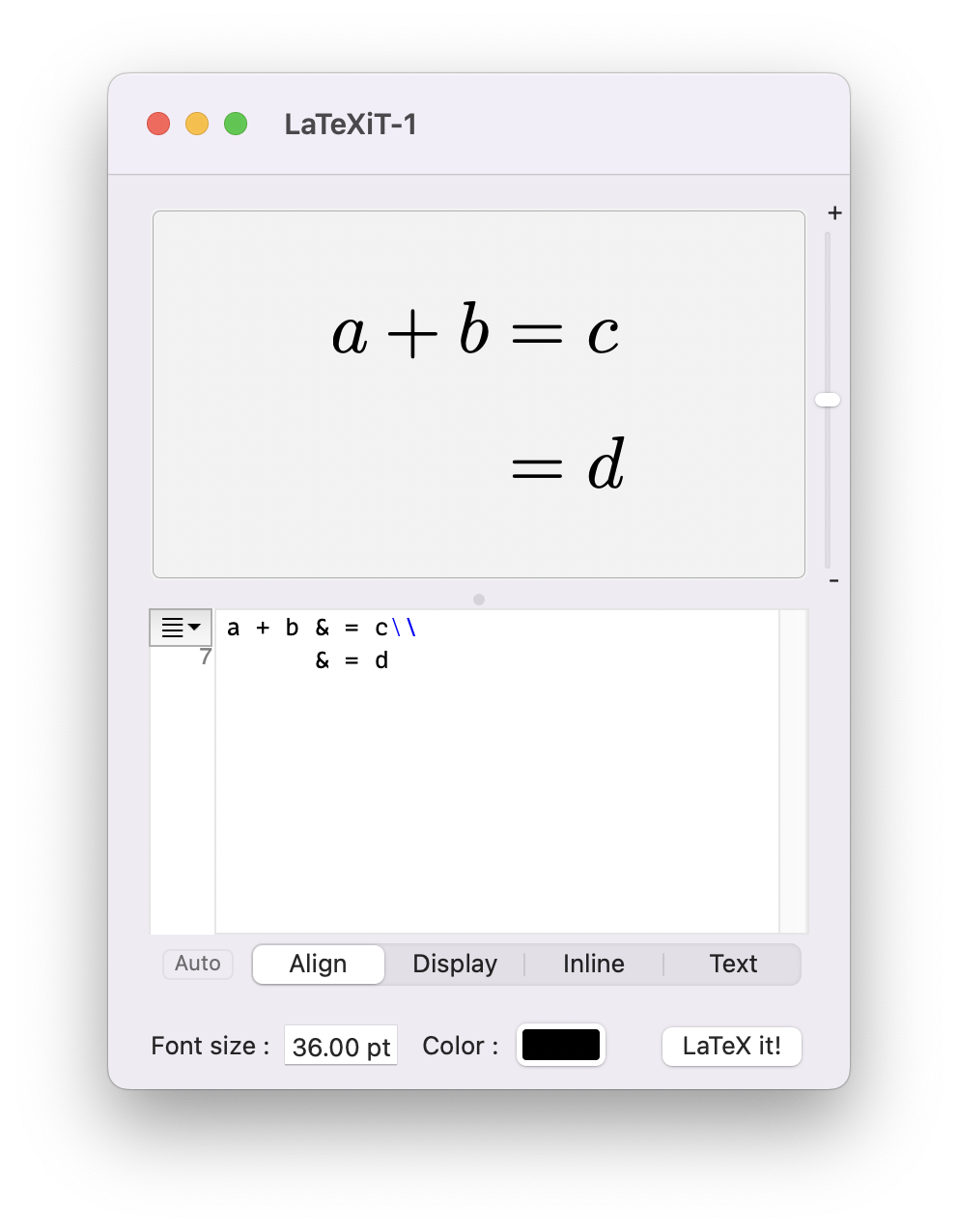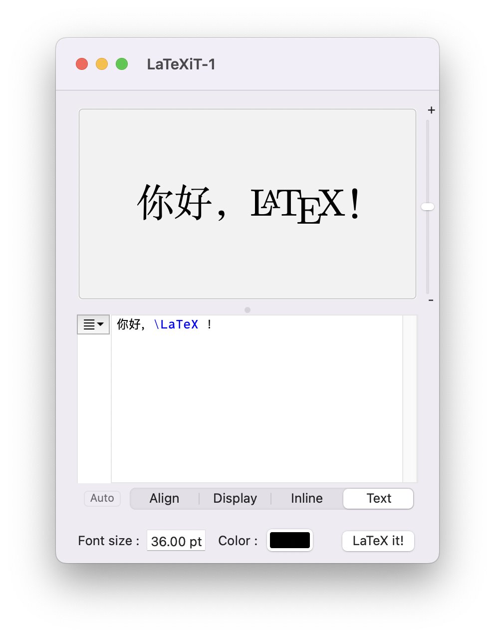 LaTeXiT 是一款方便小巧的公式渲染工具。通过输入 LaTeX 代码,它可以为我们生成公式预览并能够以多种格式导出(PDF、SVG、PNG 等等)。