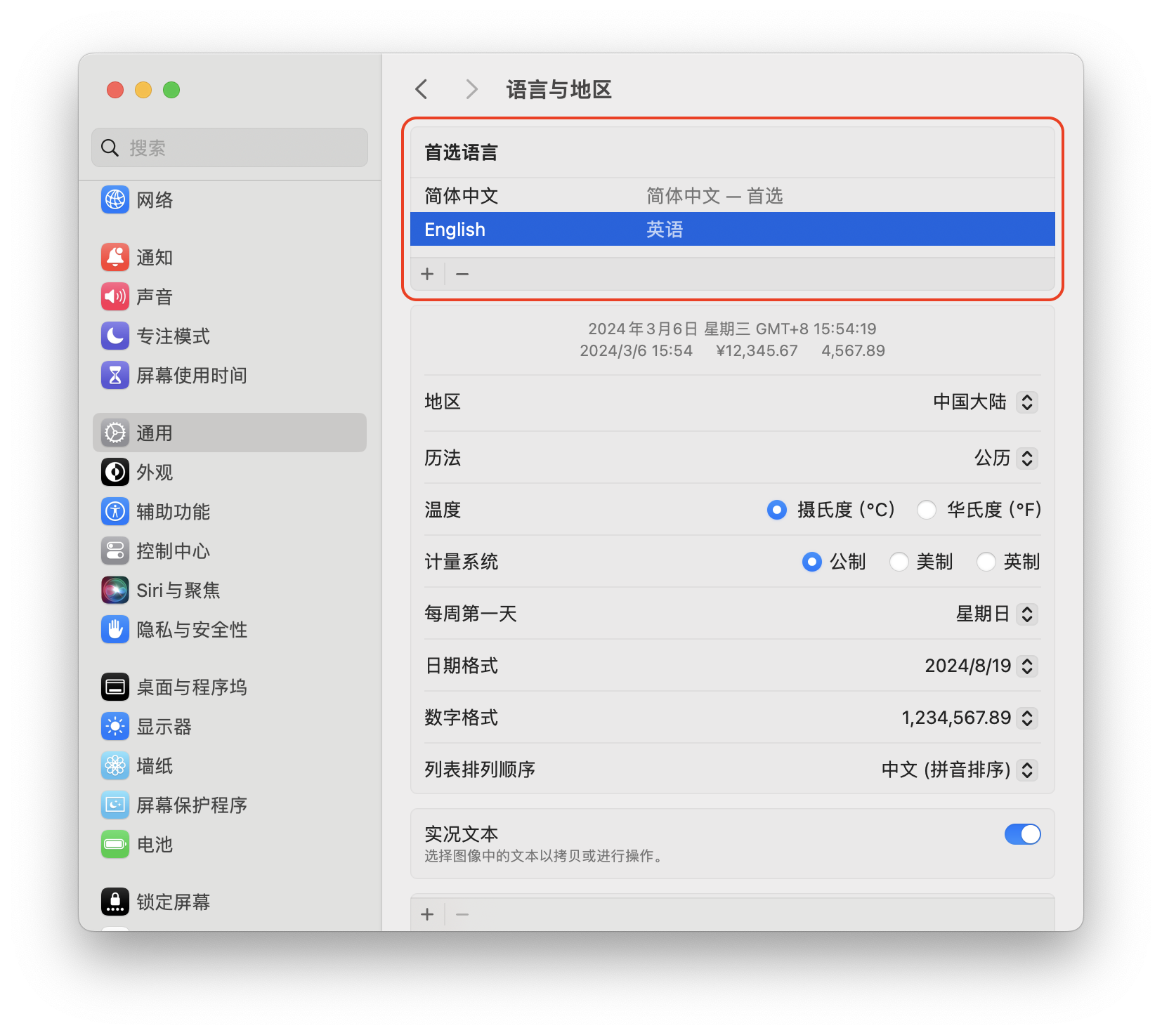 通用 > 语言与地区,在首选语言中添加English作为备选语言: