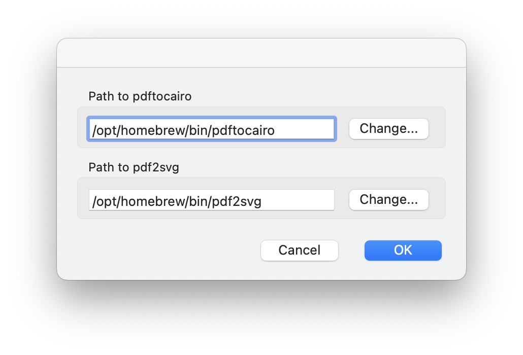 File > Export image...(⌘+E),选择 Format 为 SVG vector format,然后看到右边有一个 “⌥s...” 按钮,点开它,就可以配置 pdf2svg 和 pdftocairo 的路径了。