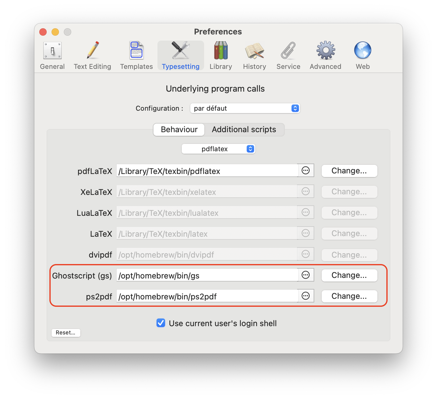 Ghostscript和ps2pdf解决方法:按下 ⌘ + , 进入设置,打开 Typesetting 标签页,然后填写 Ghostscript (gs) 以及 ps2pdf 的位置。