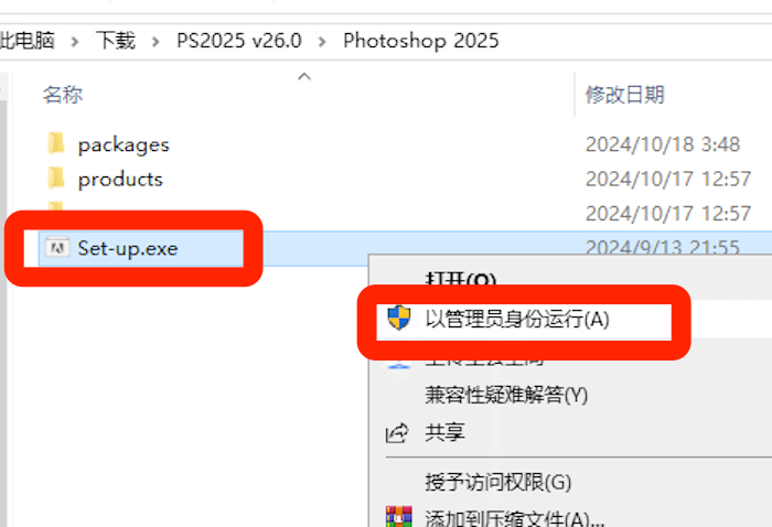 - 进入解压目录,找到“Set-up.exe”安装程序,右键→“以管理员身份运行”(关键步骤,避免权限问题)。