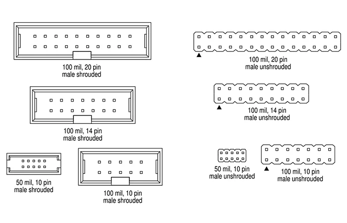 Most headers are shrouded or unshrouded male headers, with 10, 14, or 20 pins, and 0.1” or 0.05” pin pitch. Examples are shown in Figure 1.