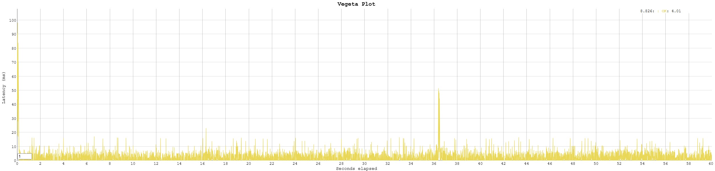 Latencies [min, mean, 50, 90, 95, 99, max] 0s, 676.024µs, 0s, 2.56ms, 3.705ms, 5.367ms, 26.437ms