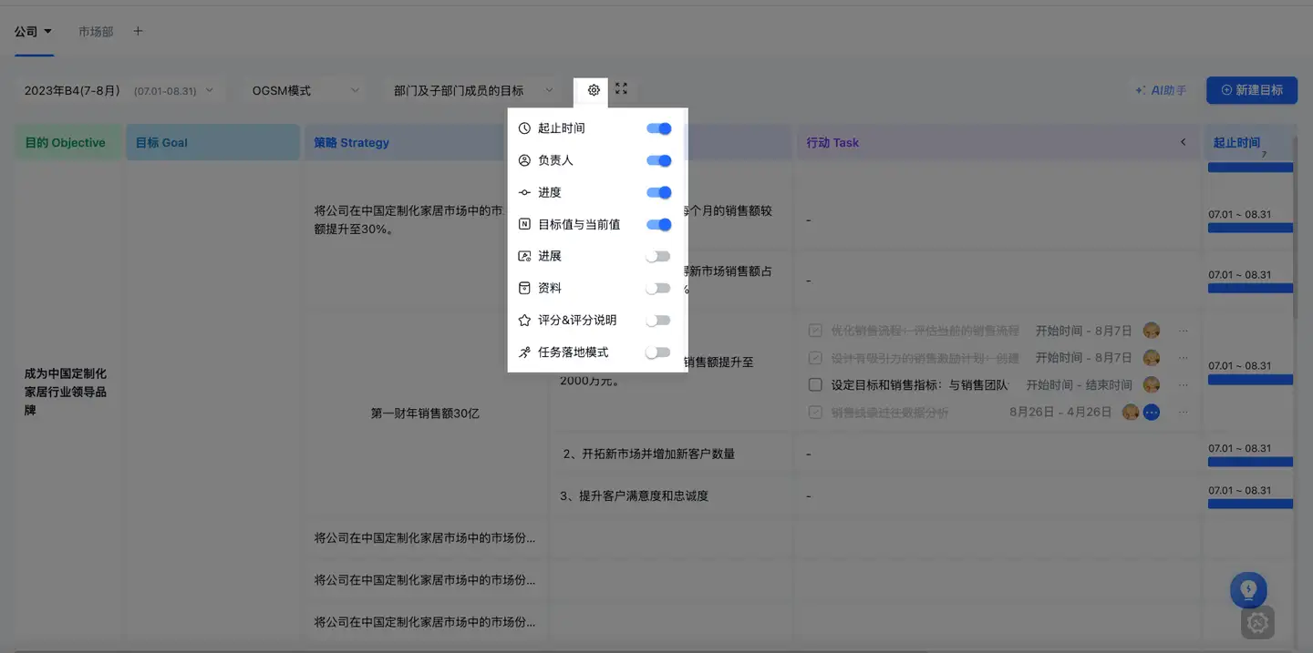 在 OGSM 模式下,您可以点击页面右上角的设置按钮,灵活配置是否显示更多辅助信息,