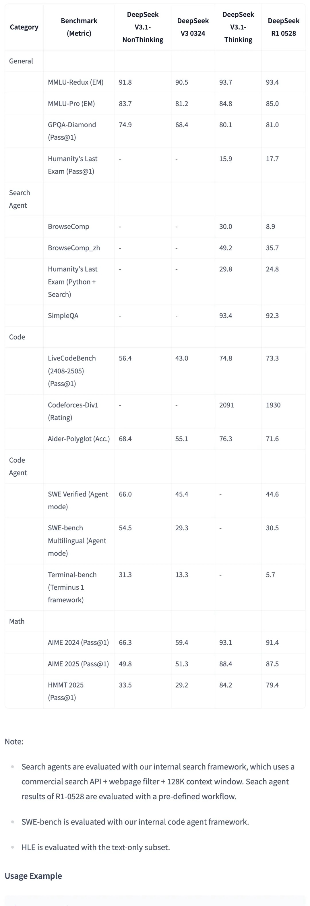 从成绩单来看,V3.1与R1-0528相比基本持平,甚至有小幅提升: