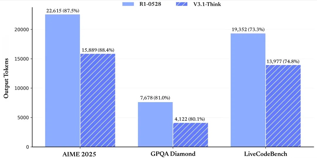 这种设计不仅提升了用户体验,还大幅提高了效率。官方测试数据显示,新版本V3.1-Think与上一代R1-0528相比,在保持同等回答质量的情况下,响应速度更快,且token消耗减少了20%-50%。