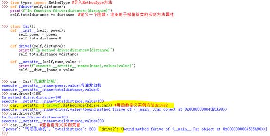 >>> car.__setattr__('drive2',MethodType(fdrive,car)) #用函数定义实例方法drive2