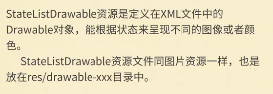 StateListDrawable 用于组织多个 Drawable 对象.当使用 StateListDrawable 作为目标组件 的背景.前景图片时,StateListDrawable 对象所显示的 ...