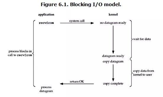 当用户进程调用了recvfrom这个系统调用,kernel就开始了IO的第一个阶段:准备数据。对于network io来说,很多时候数据在一开始还没有到达(比如,还没有收到一个完整的UDP包),这个时候kernel就要等待足够的数据到来。而在用户进程这边,整个进程会被阻塞。当kernel一直等到数据准备好了,它就会将数据从kernel中拷贝到用户内存,然后kernel返回结果,用户进程才解除block的状态,重新运行起来。