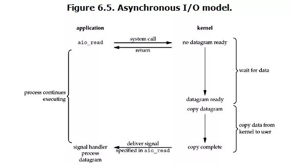 用户进程发起read操作之后,立刻就可以开始去做其它的事。而另一方面,从kernel的角度,当它受到一个asynchronous read之后,首先它会立刻返回,所以不会对用户进程产生任何block。然后,kernel会等待数据准备完成,然后将数据拷贝到用户内存,当这一切都完成之后,kernel会给用户进程发送一个signal,告诉它read操作完成了。