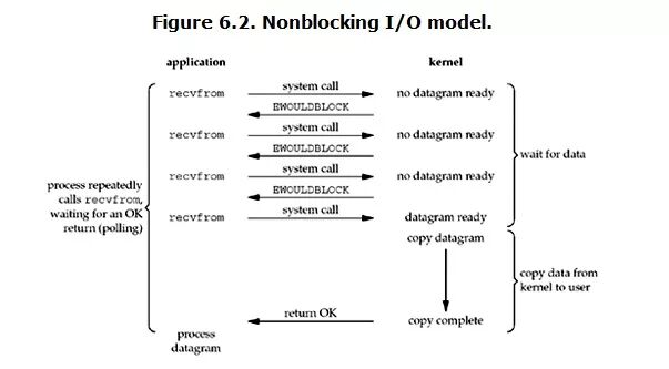 从图中可以看出,当用户进程发出read操作时,如果kernel中的数据还没有准备好,那么它并不会block用户进程,而是立刻返回一个error。从用户进程角度讲 ,它发起一个read操作后,并不需要等待,而是马上就得到了一个结果。用户进程判断结果是一个error时,它就知道数据还没有准备好,于是它可以再次发送read操作。一旦kernel中的数据准备好了,并且又再次收到了用户进程的system call,那么它马上就将数据拷贝到了用户内存,然后返回。