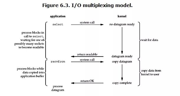 当用户进程调用了select,那么整个进程会被block,而同时,kernel会“监视”所有select负责的socket,当任何一个socket中的数据准备好了,select就会返回。这个时候用户进程再调用read操作,将数据从kernel拷贝到用户进程。