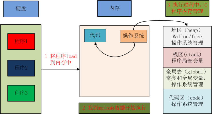 可以简单直观的查看下面的这个图片,直接的说明我们的程序在内存中是如何去存储,运行。。。。