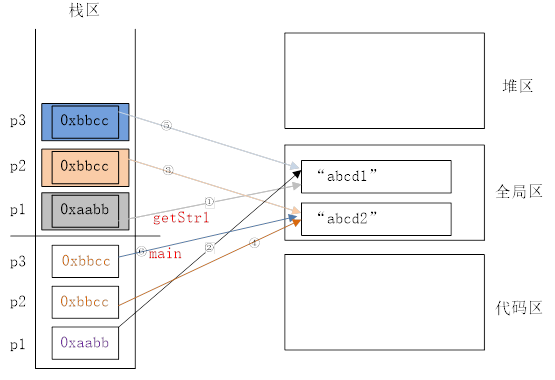 3、在常量区定义字符串”abcd1”,然后getStr1中的p1指针指向这个字符串(图中①,为黑色),假设字符串”abcd1”的首地址为0xaabb;