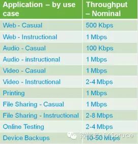 会,那么会有很多人上传视频,带宽分配需要重新考虑,每个人至少有一个设备应保证1Mbps带宽。如果是小组讨论会,那么带宽需求就会小得多。下图是一些